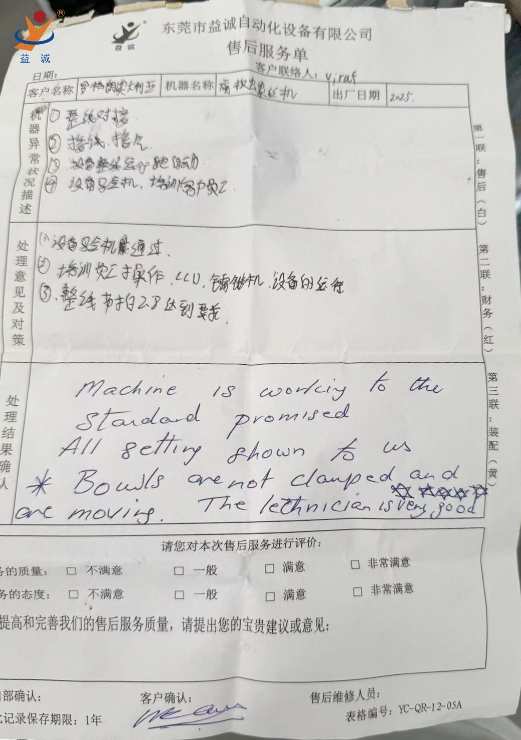 潘总经理表示:“你们远渡重洋,以专业服务客户的身影,正是益诚人服务精神的生动写照!你们用行动深刻诠释了益诚自动化的服务精神——客户至上、使命必达,以专业与勇气书写了益诚跨国服务的壮丽篇章。我坚信,在优秀益诚人的齐心协力下,益诚在全球化服务的征程中必将再谱华章、再创辉煌!”