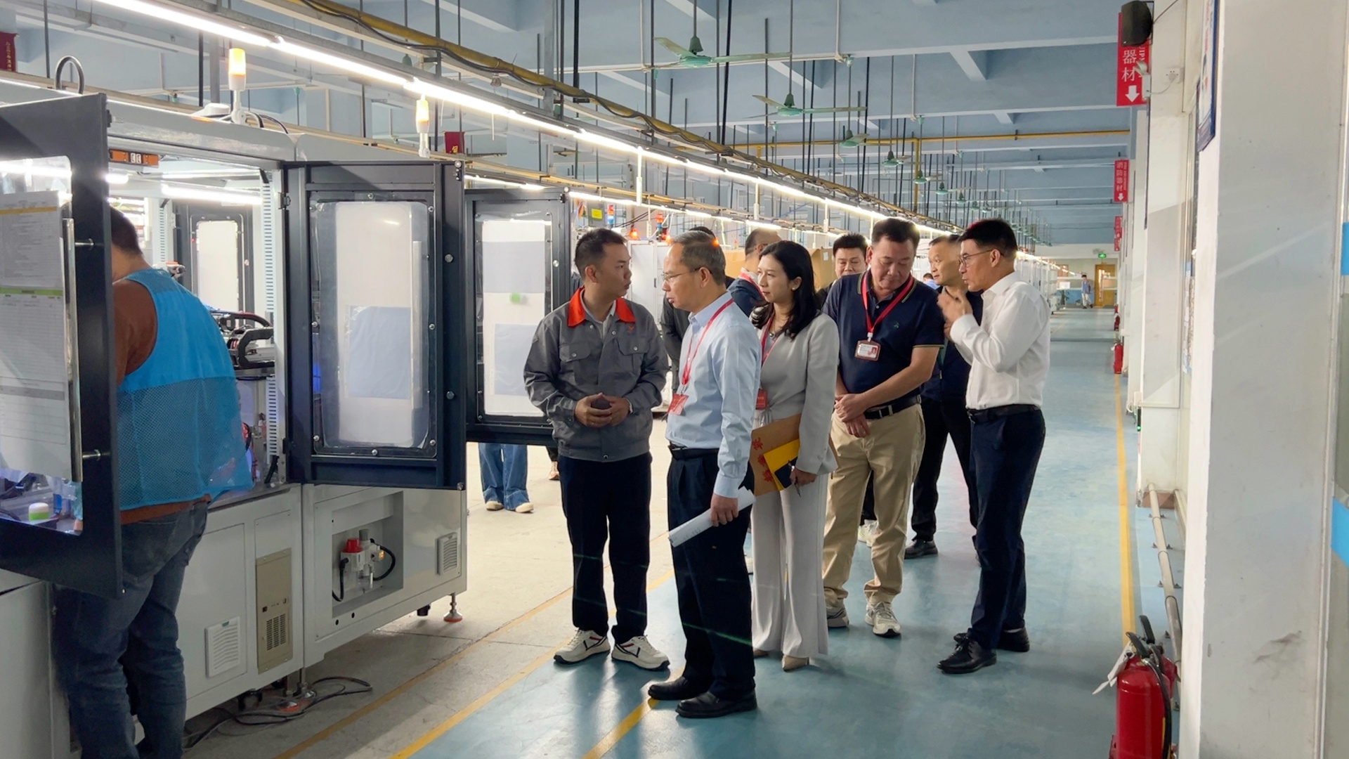 调研伊始,袁董事长与潘总经理带调研团队实地参观了益诚自动化的智能生产车间,为到访调研团队详细介绍了益诚研制设备的性能特点、技术优势以及在生产流程中的关键作用,让调研团队对益诚自动化的生产智造水平有了直观且深入的了解。